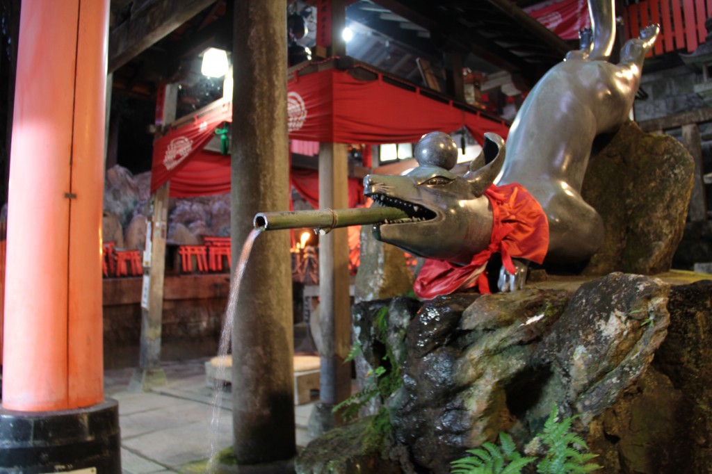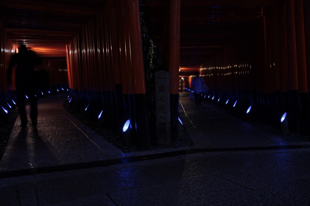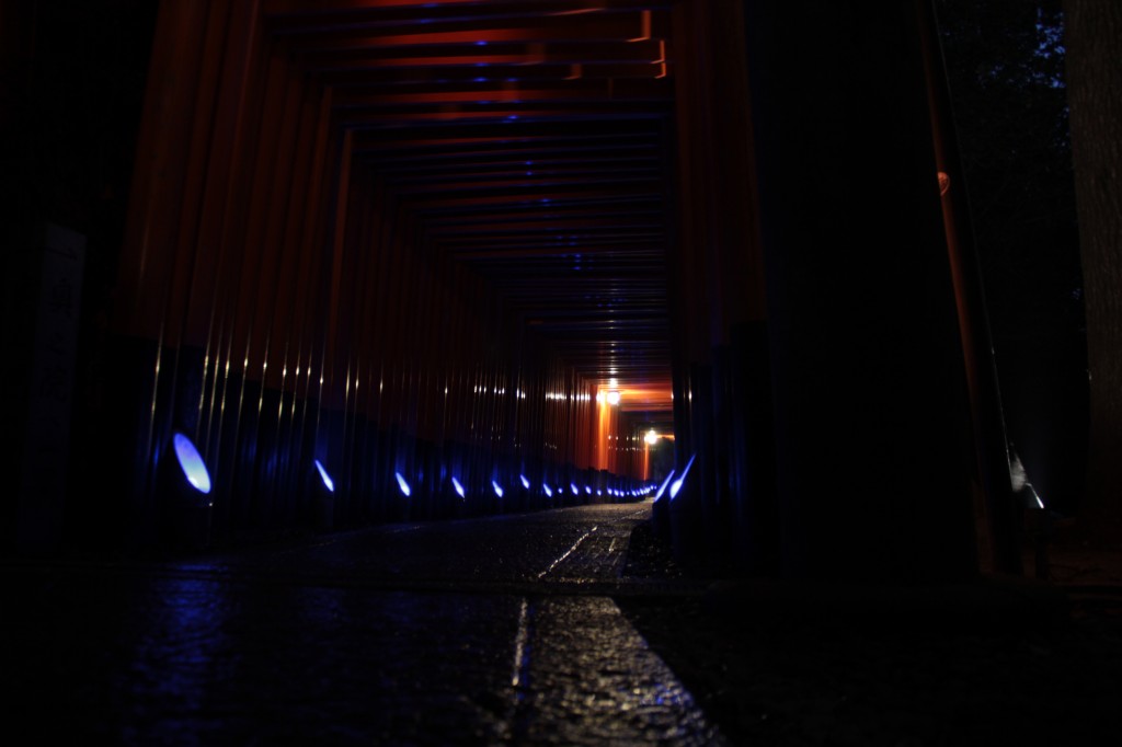 すっかり日が落ちると、千本鳥居がLEDライトでライトアップされていました。昼間の賑わいとは全く違う、静寂と光のコントラストがとても幻想的です。