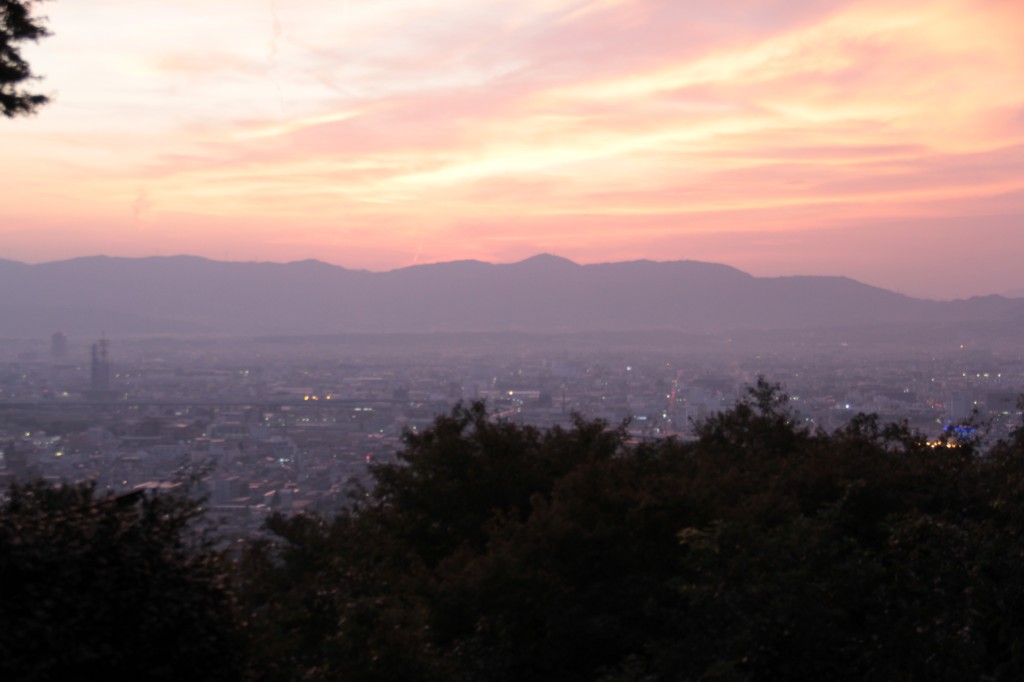 ある程度の高さまで登ると、京都の街並みを見下ろせる夜景スポットが開けてきます。夕暮れ時の空のグラデーションがとても綺麗です。