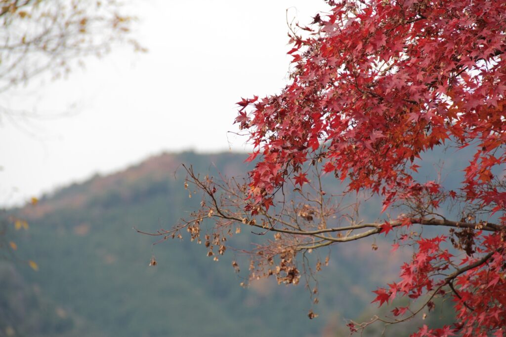 静寂に包まれた境内に、赤や黄色に色づいた木々が美しく映えていました。