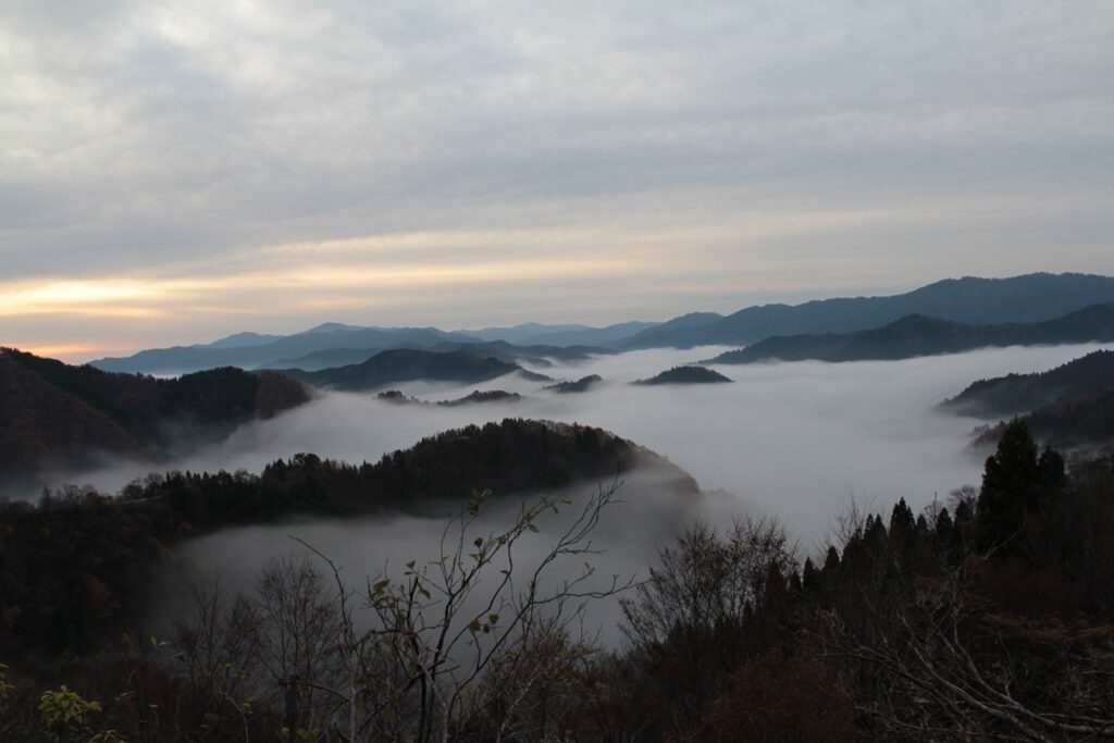 山々の間を埋め尽くすように漂う白い雲海と、朝日に照らされた紅葉のコントラストが本当に美しいです。