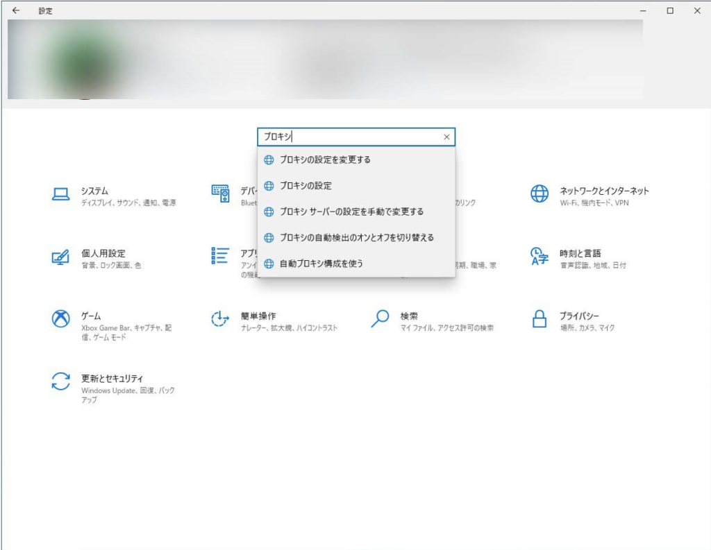 Windows10の場合は【設定】にある検索ボックスに「プロキシ」と入力すると候補が上がるので、そこから遷移できます。