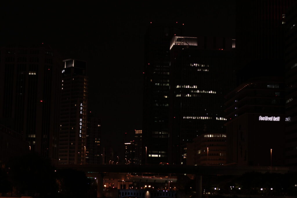 淀屋橋のようなビジネス街は会社がお休みのところが多いため、オフィスビルの窓明かりが少なく、全体的に少し暗くて寂しい印象になってしまいました。